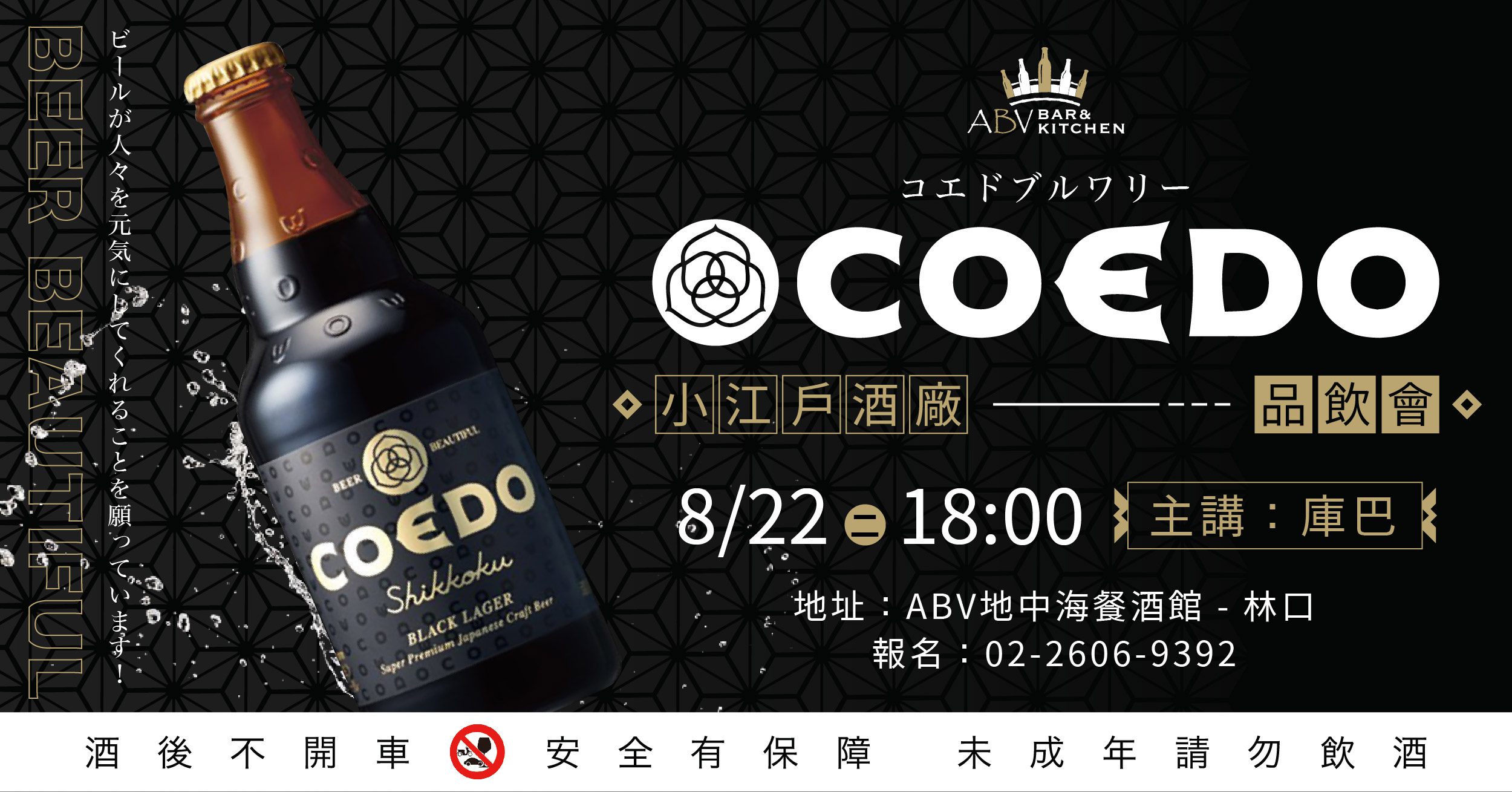 琉璃(Ruri)/白(Shiro)/伽羅(Kyara)/紅赤(Beniaka)/漆黑(Shikkoku)/毬花(Marihana)便是六款Coedo最知名的啤酒,每一款都是百分百以麥芽釀製,承如其標語 「Beer Beautiful」希望啤酒能讓人美好,品飲時再搭配適宜的料理,使所有啤酒相關的體驗昇華。這次的品飲會就讓ABV帶領各位一起品嚐來自小江戶的手工啤酒吧!