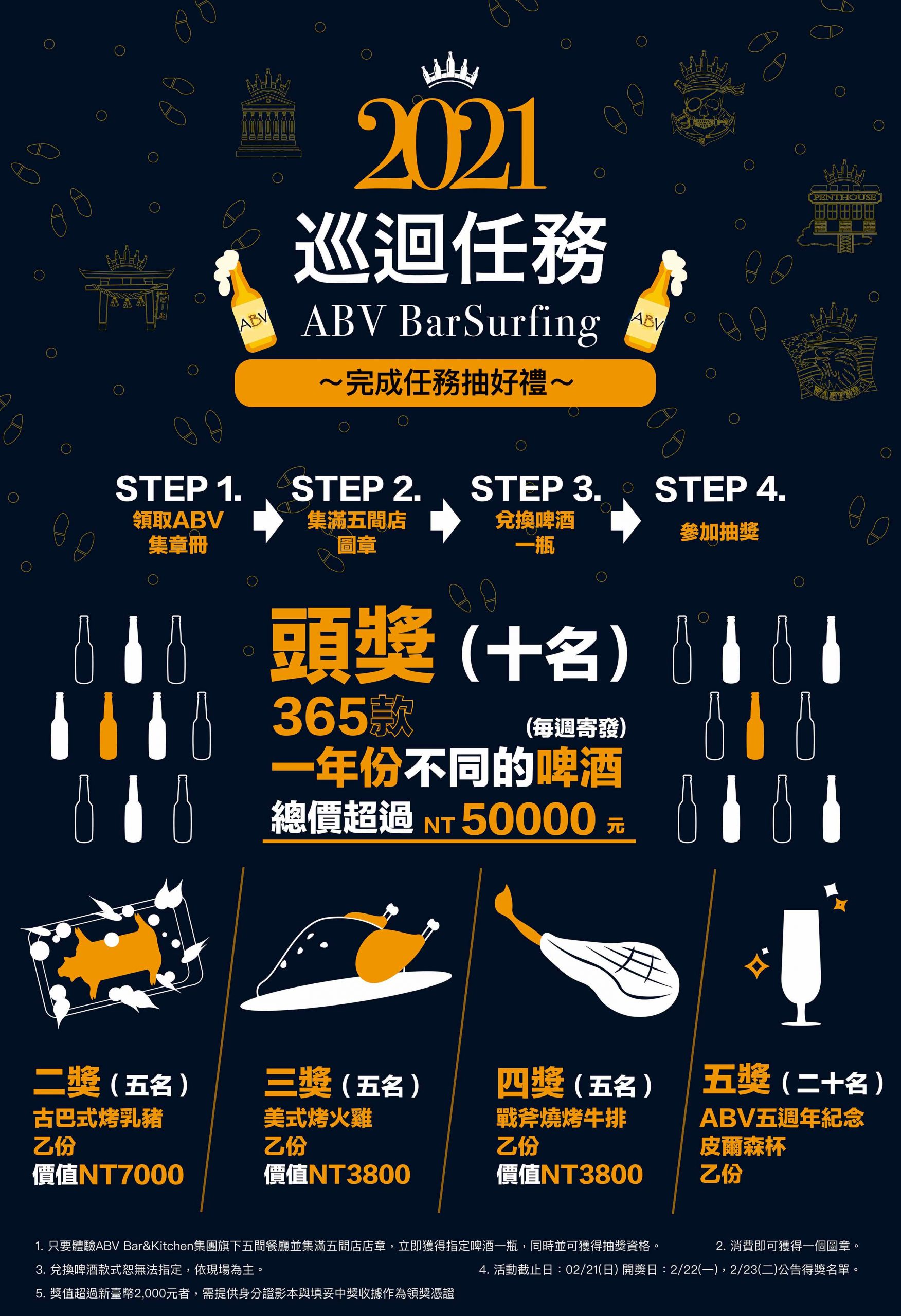 1. 在任何一間ABV餐廳用餐,記得要領取ABV環遊護照,並在2021年2月21日前,體驗完我們ABV旗下所有餐廳,並蒐集到所有餐廳的店章,立即可以獲得乙瓶啤酒兌換(酒款由ABV餐廳提供)。
