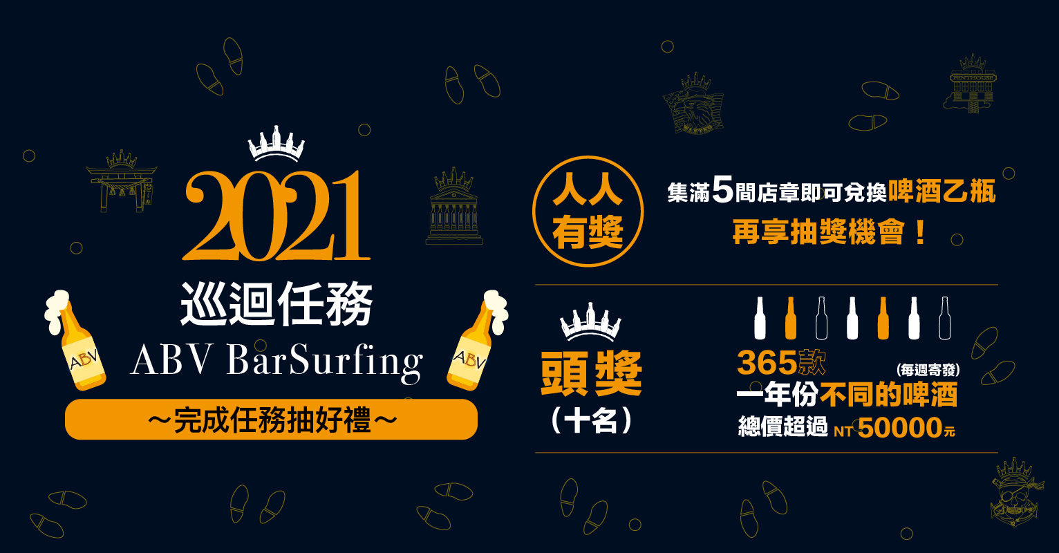 1. 只要體驗ABV Bar&Kitchen集團旗下五間餐廳並蒐集完五間店的店章,立即獲得指定啤酒一瓶,同時並可獲得抽獎資格。