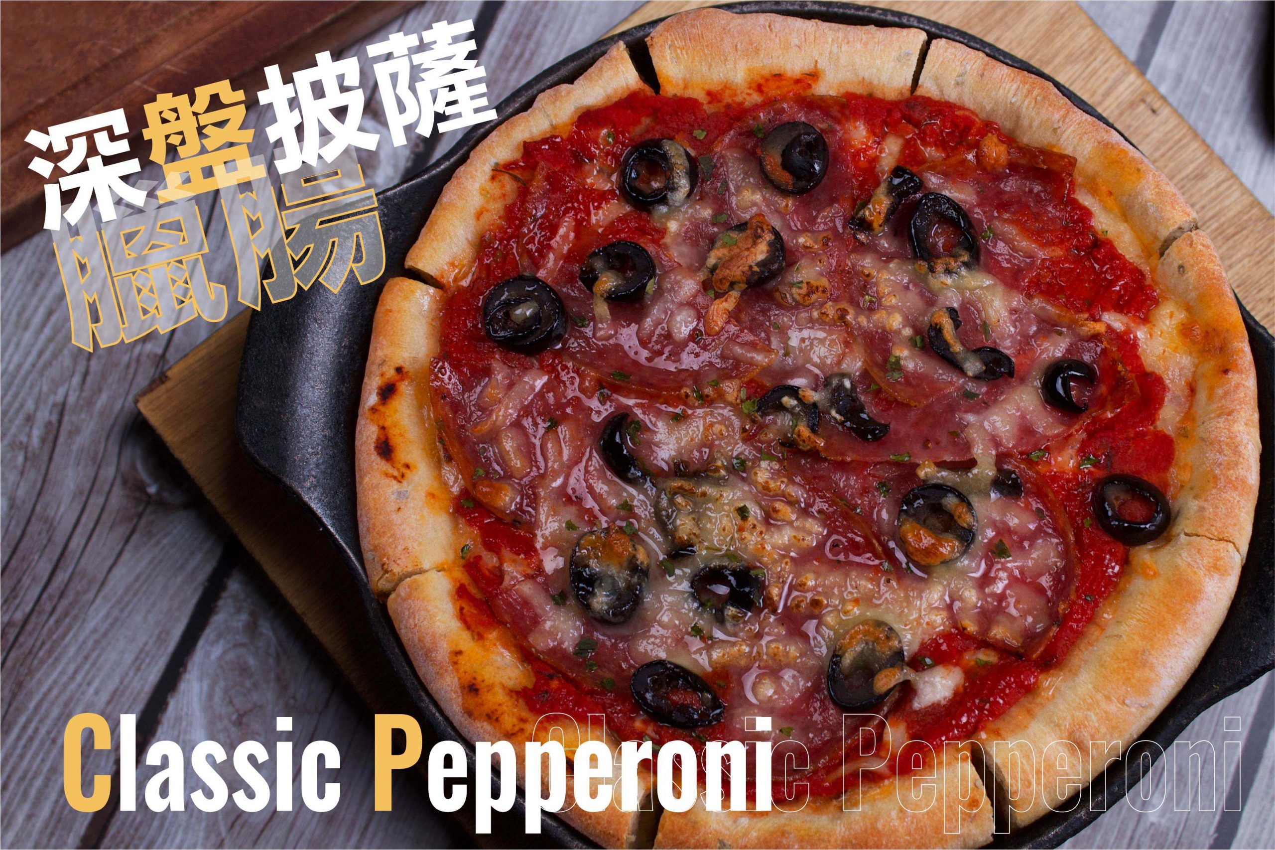相傳1943年發明於芝加哥的獨特料理。為了讓更大更深的餅皮能夠在烤箱中完全熟透,便把食材放置順序顛倒過來,在壓制成形的餅皮上撒上起司,再依序放入食材、起司、第二層食材,最上層則以大量蕃茄Sauce覆蓋,這樣不僅能避免起司被烤焦,更創造出深盤披薩的獨特風味。