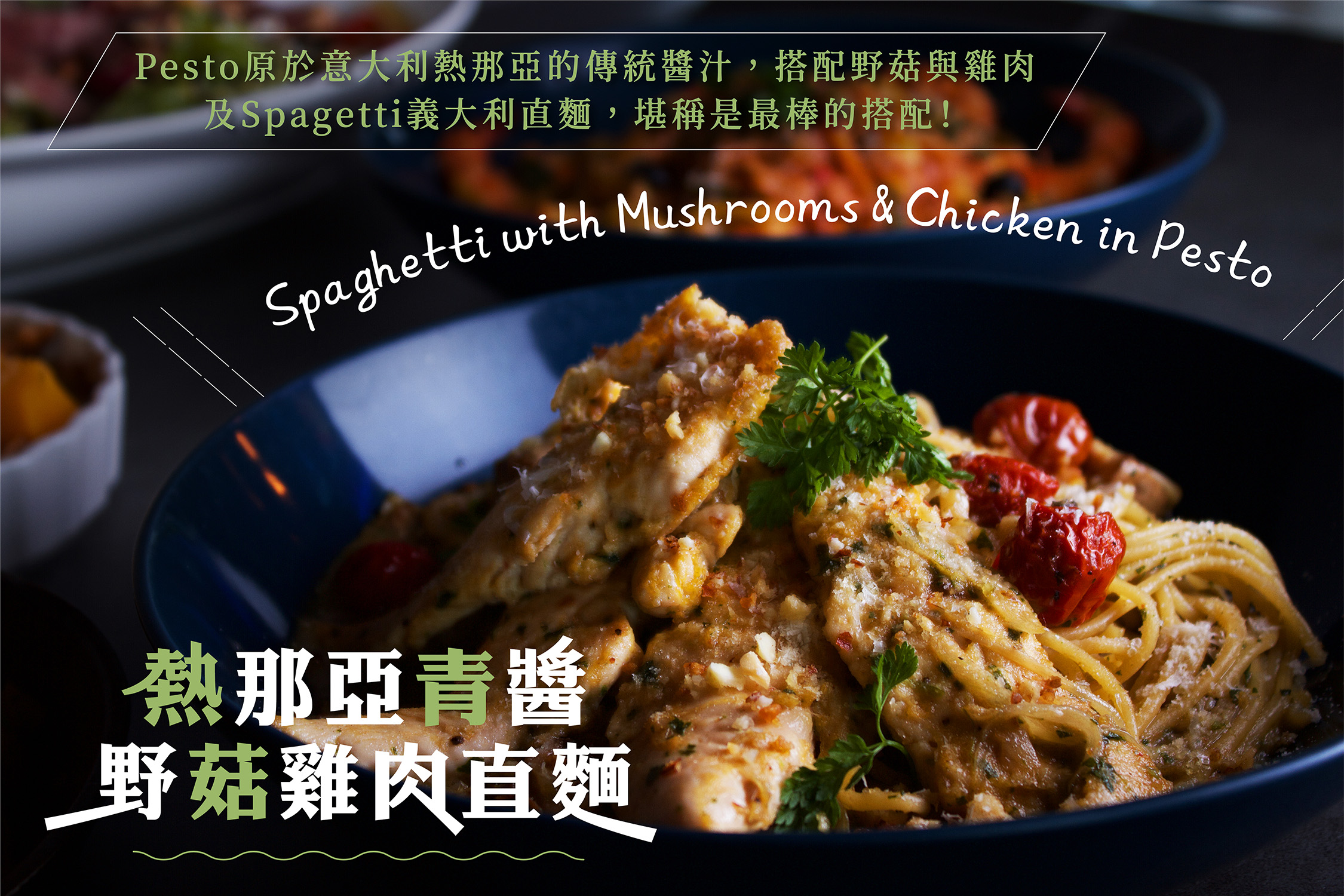 ABV主廚以經典的熱那亞青醬,搭配野菇與雞肉以及Spagetti義大利直麵,青草與蒜香跟野菇與雞肉堪稱是最棒的搭配。