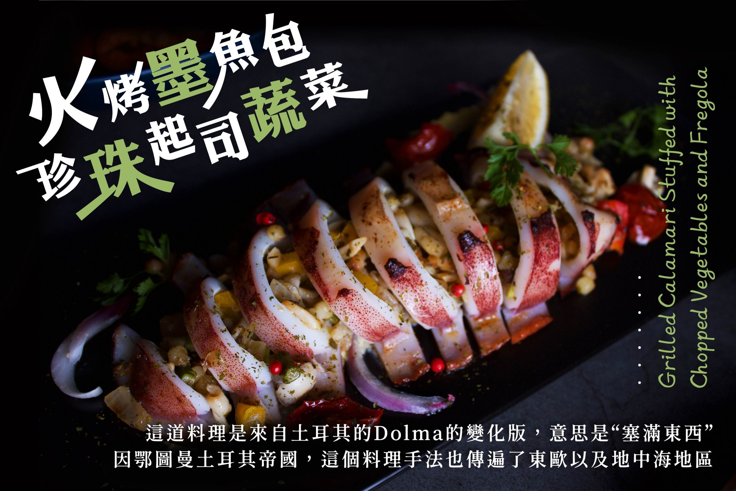 ABV主廚以各種蔬菜丁,酸豆、鯷魚以及薩丁尼亞珍珠麵(Fregula)塞滿到整隻墨魚裡,火烤而成,搭配檸檬奶油醬,一起品嚐。整體風味與口感變化,以及食材之豐富,讓人驚艷。