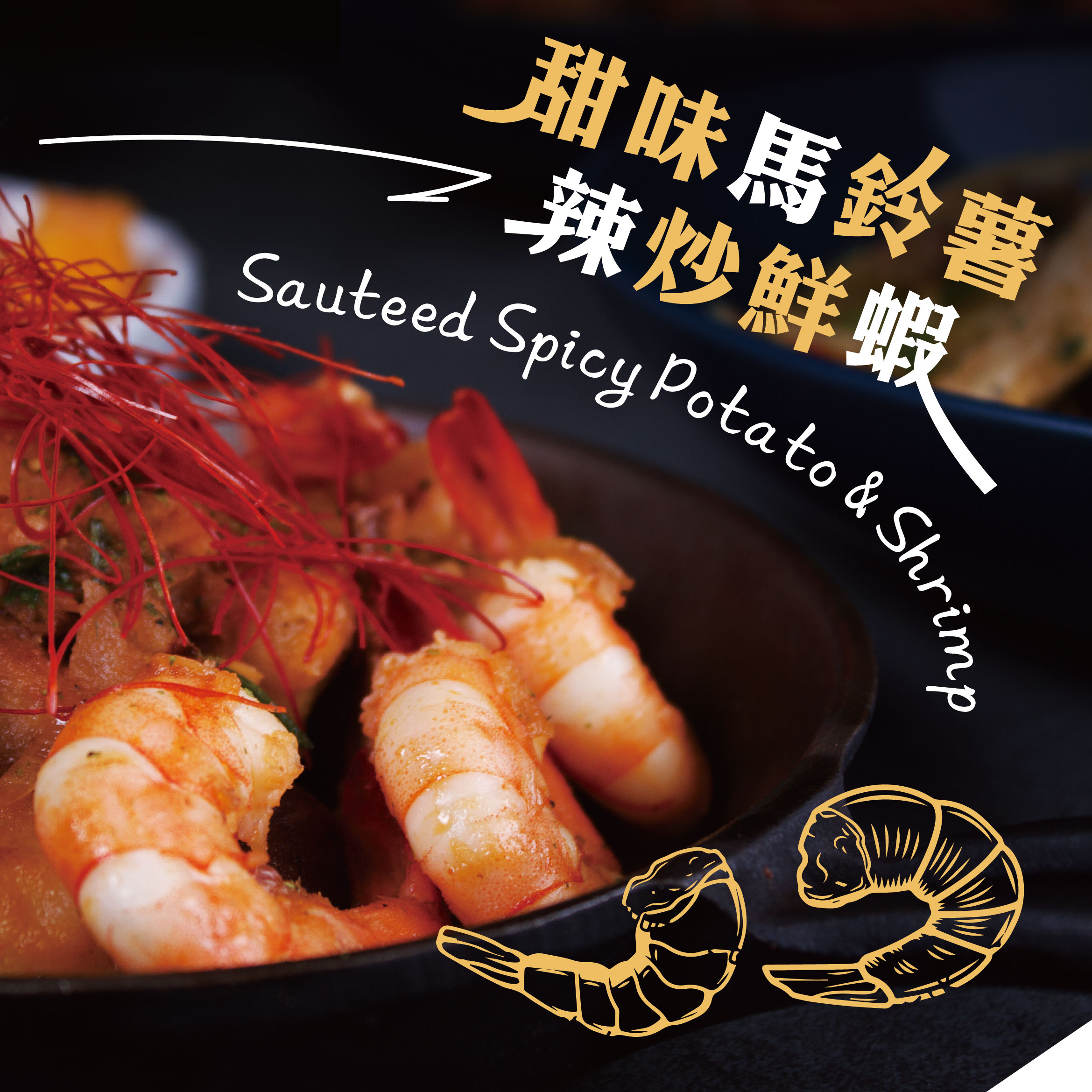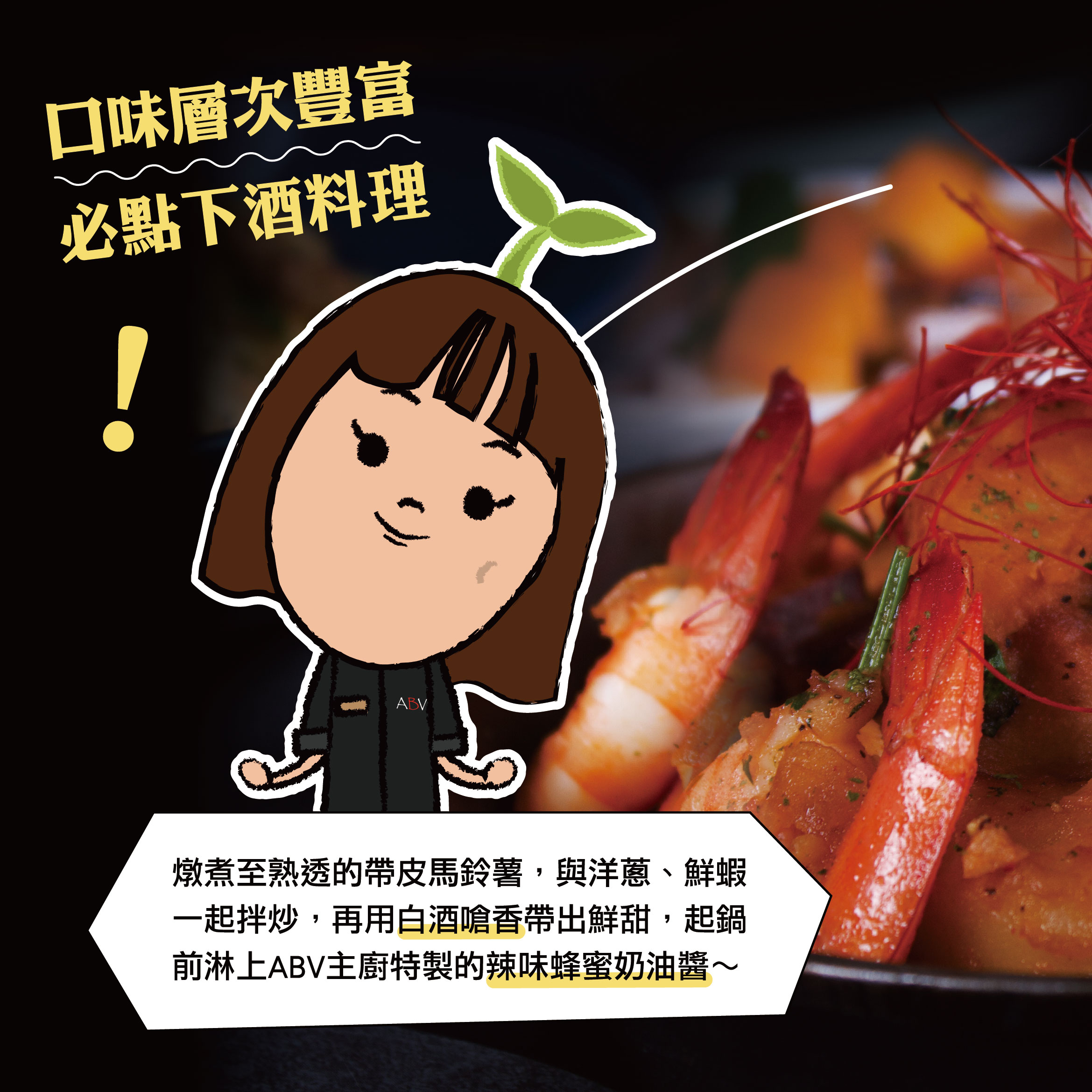煮至熟透的帶皮馬鈴薯,與洋蔥、鮮蝦、一起拌炒,再用白酒嗆香帶出鮮甜,起鍋前淋上ABV主廚特製的辣味蜂蜜奶油醬,口味層次豐富,是必點的下酒料理。