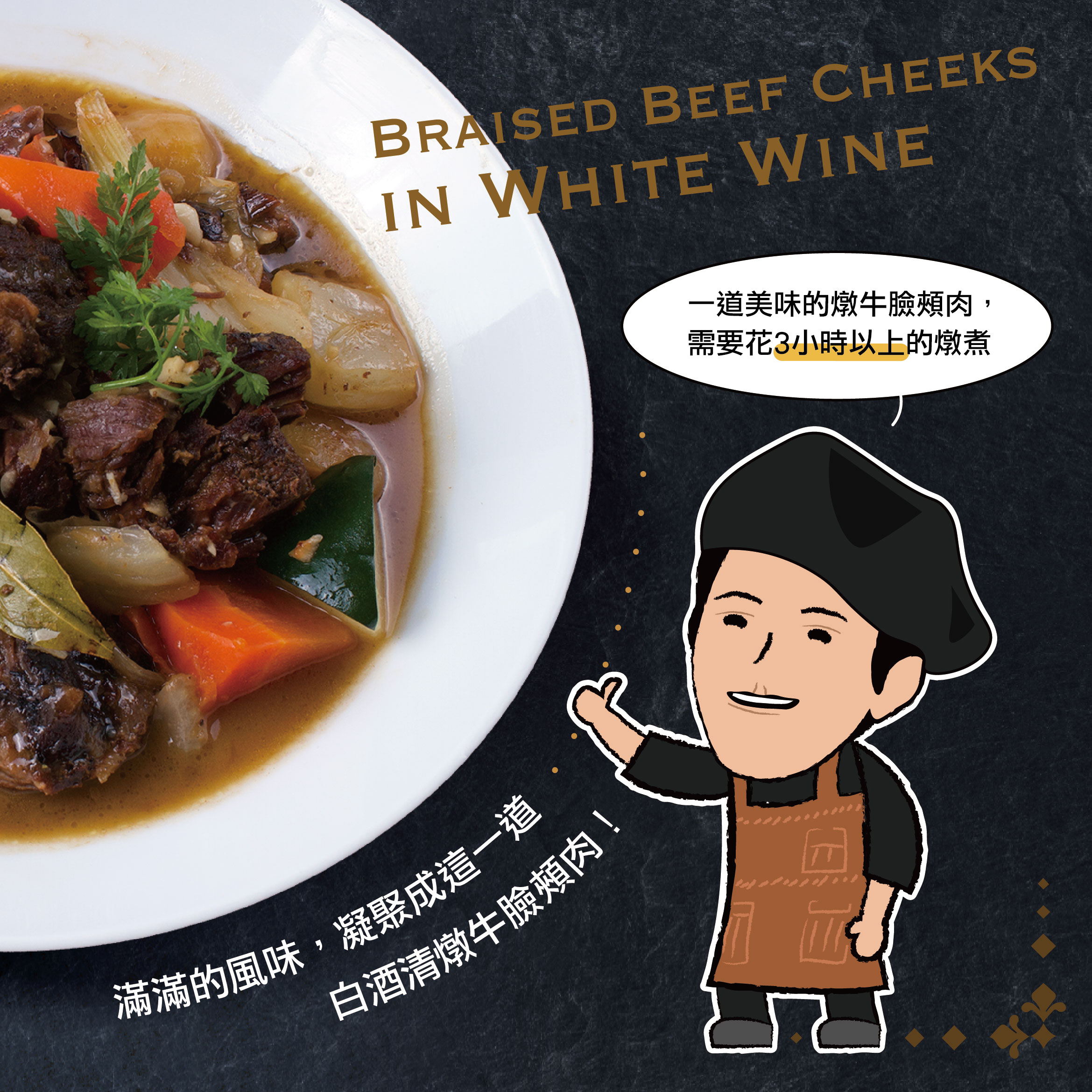 一道美味的燉牛臉頰肉,需要至少花上3個小時以上的燉煮,以及把牛臉頰肉修乾淨。ABV主廚先以大火快煎牛臉頰肉,再以白酒嗆香之後長時間燉煮至軟嫩,再將甜菜根、紅蘿蔔等根莖蔬菜,一起熬煮,滿滿的風味,凝聚成這一道白酒清燉牛臉頰肉。