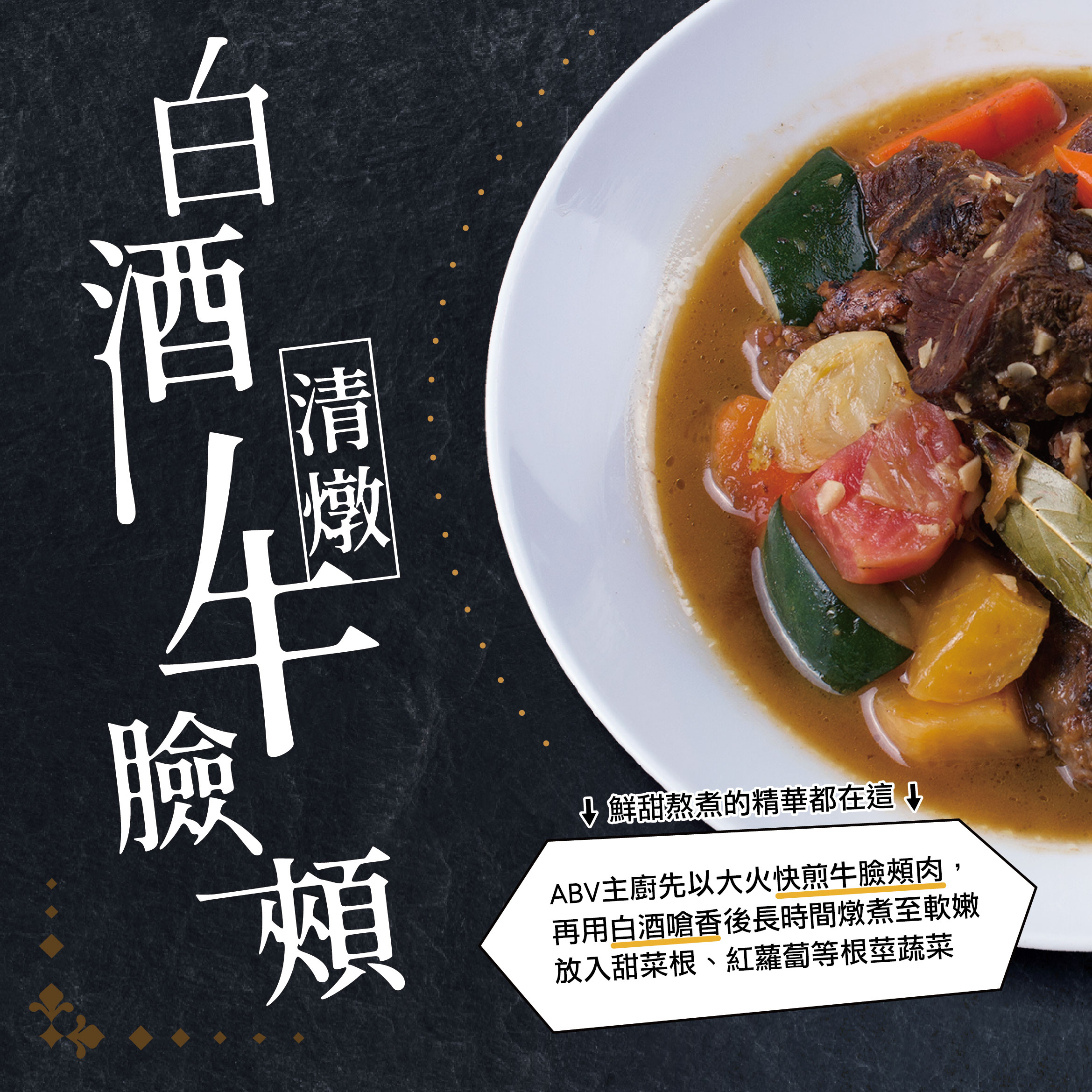 一道美味的燉牛臉頰肉,需要至少花上3個小時以上的燉煮,以及把牛臉頰肉修乾淨。ABV主廚先以大火快煎牛臉頰肉,再以白酒嗆香之後長時間燉煮至軟嫩,再將甜菜根、紅蘿蔔等根莖蔬菜,一起熬煮,滿滿的風味,凝聚成這一道白酒清燉牛臉頰肉。