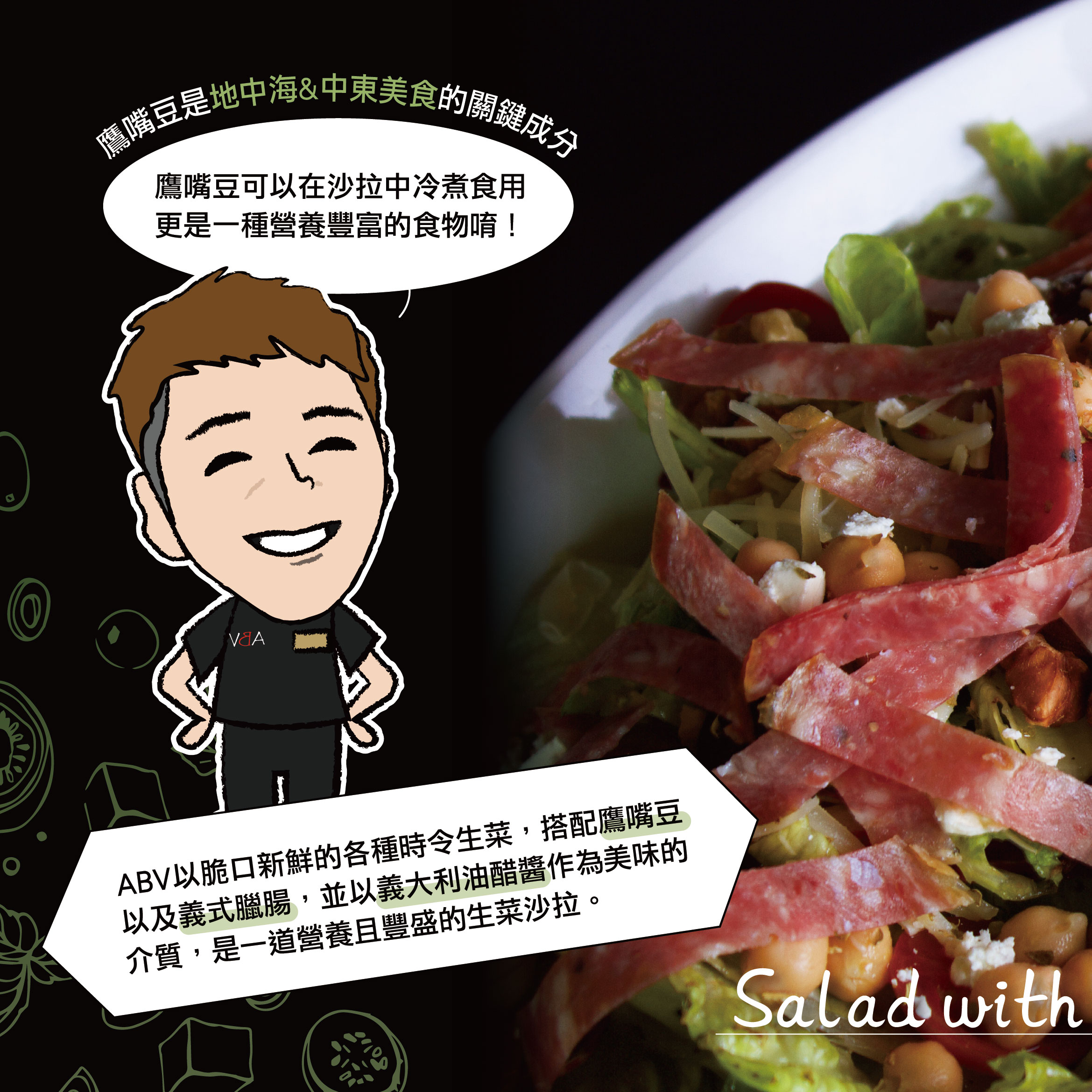 鷹嘴豆是地中海和中東美食的關鍵成分,成熟的鷹嘴豆可以在沙拉中冷煮和食用,他更是一種營養豐富的食物。ABV以脆口新鮮的各種時令生菜,搭配鷹嘴豆,以及義式臘腸,並以義大利油醋醬作為美味的介質,是一道營養且豐盛的生菜沙拉。