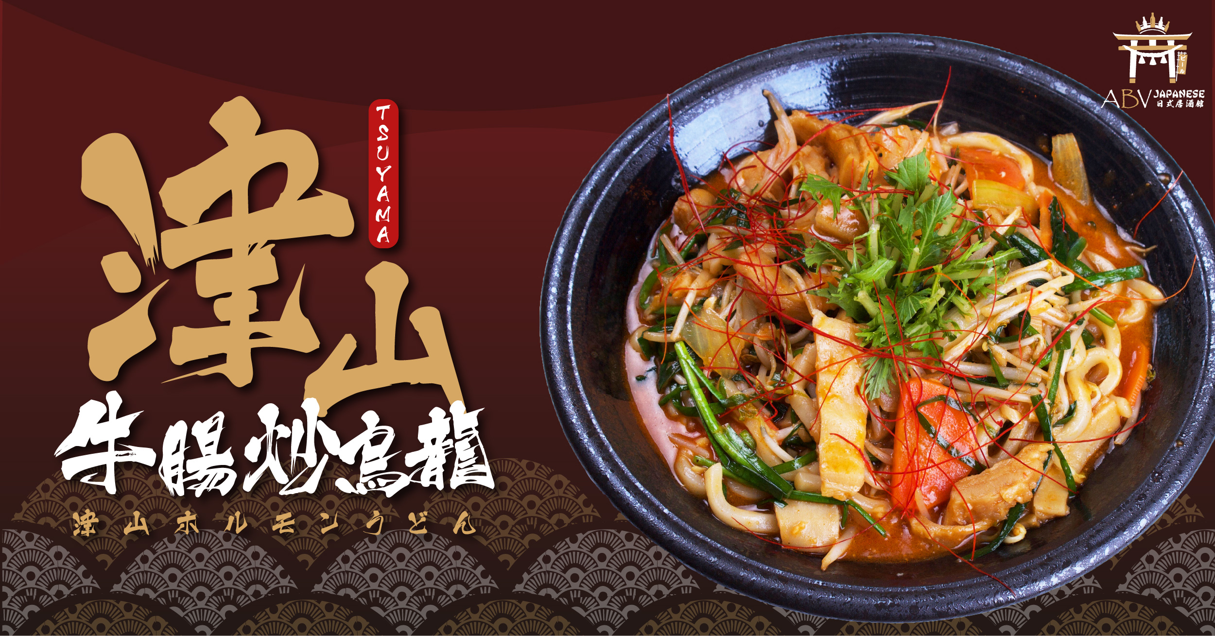 ABV按照職人工法,在炙熱的鐵板上放上牛腸,炒出油脂之後,加入烏龍麵、脆口蔬菜、特製辣味增醬拌炒,津山風的鐵板牛腸炒烏龍完美上桌!