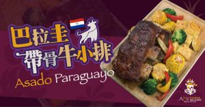 Asado在南美洲指的就是烤肉料理文化。指的是藉由炭火高溫與煙燻火烤牛肉熟成的烹飪方式。最適合Asado烤肉的部位,一個是帶骨肋排,一個是厚腹脇肋排,以及牛小排。ABV的巴拉圭烤肉選擇帶骨的牛小排,讓大家可以品嚐到更多層次的牛肉口感,並搭配巴拉圭國家美食Chipa Guazu-巴拉圭玉米糕和木薯一起享用。