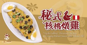 奶香濃郁、香辣帶勁,忍不住一口接一口的好味道!以秘魯特產黃辣椒Aji、起司、牛奶與蒜頭熬煮成鮮黃微辣的醬汁,再加入雞肉(Gallina)一同燉煮,最後放上水煮蛋切片與橄欖。簡單、迷人,卻能輕易吸引目光的一道秘魯佳餚。