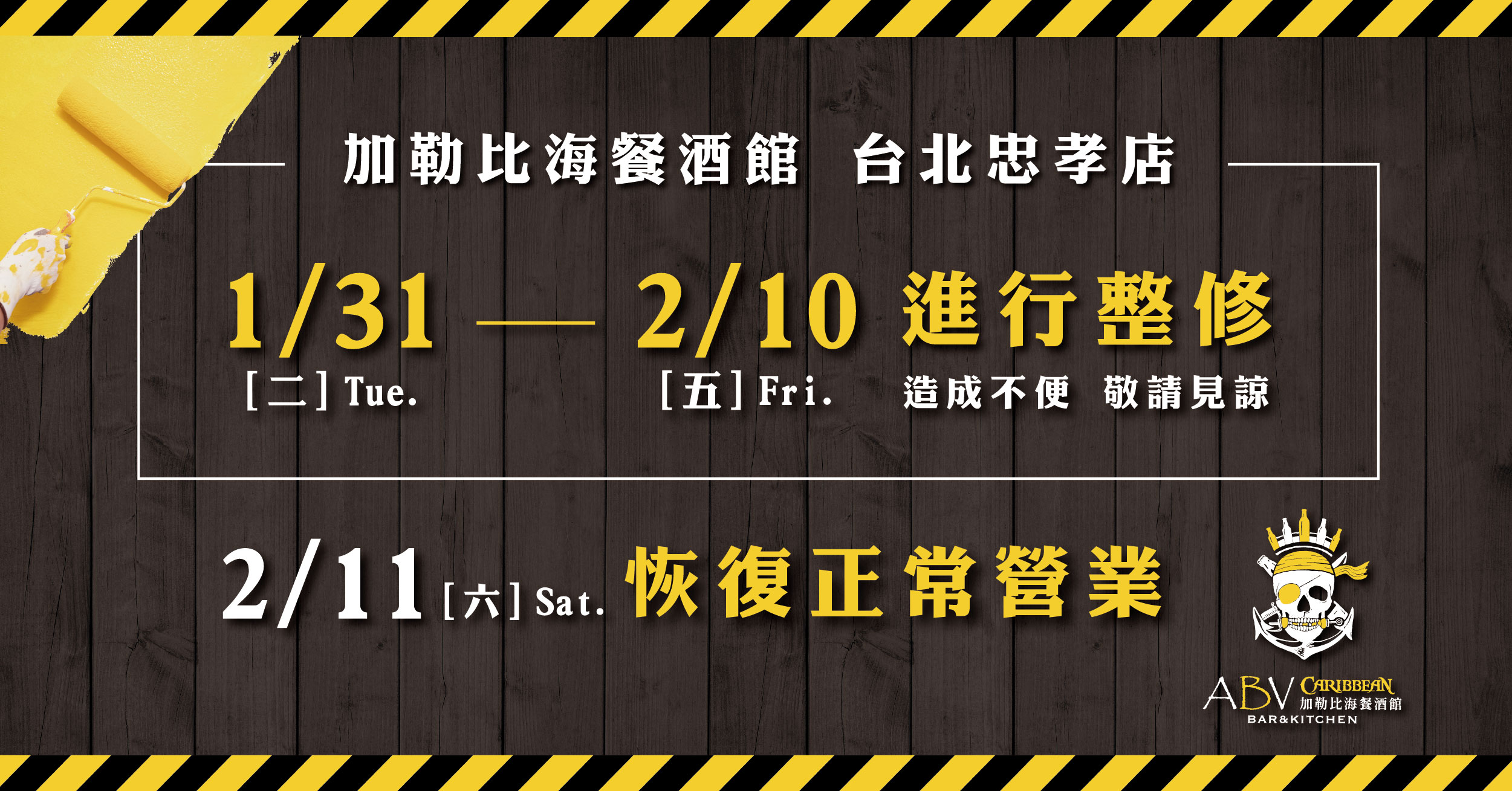 ABV加勒比海餐酒館 台北忠孝店 整修公告