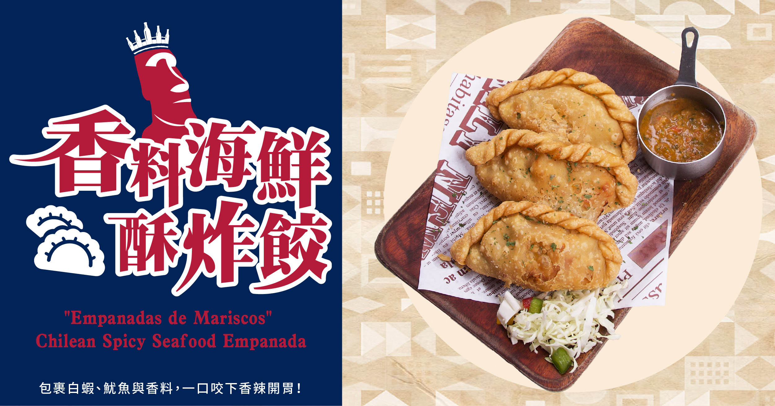 名稱起源於西班牙語empanar,意思是“在麵糰裏填入餡料並在烤箱中 烘烤”。智利豐富的漁業資源讓原本的豬肉餡多了海鮮版本!ABV將白蝦 及魷魚切丁後加入蒜碎、智利辣椒醬等香料炒香,再將其包裹並炸至金 黃,一道香味四溢又十足開胃的辣味海鮮酥炸餃即可享用。