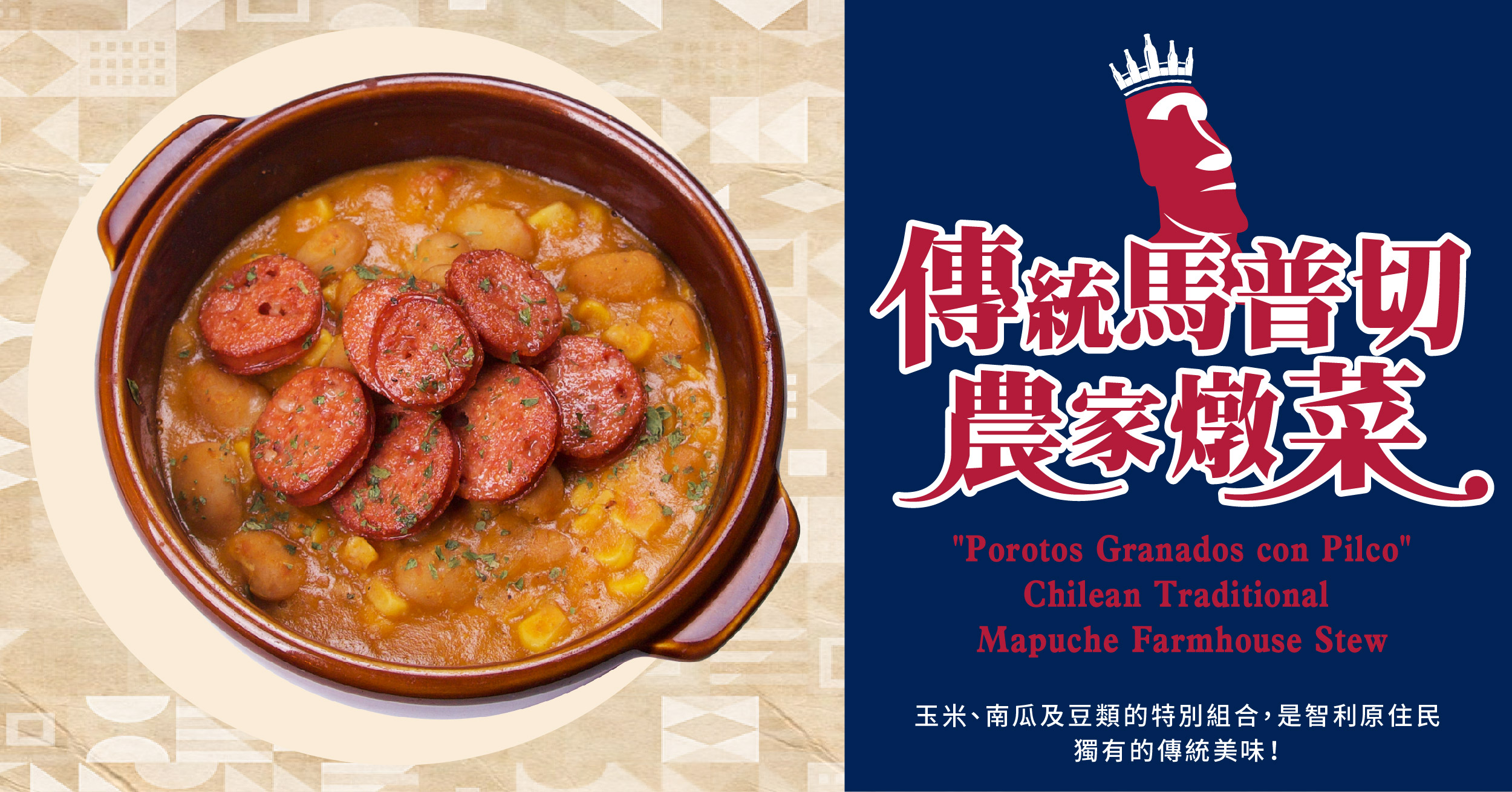 這道料理源自於在智利中南部的土著民族-馬普切,在族中有一個稱為 Pidco的特色豆子,後來語意演變成現在的Pilco,將其與玉米跟南瓜 一起燉煮的菜餚,便是馬普切當地土著的傳統菜餚。ABV以奶油豆代替, 復刻出這道美味的料理。