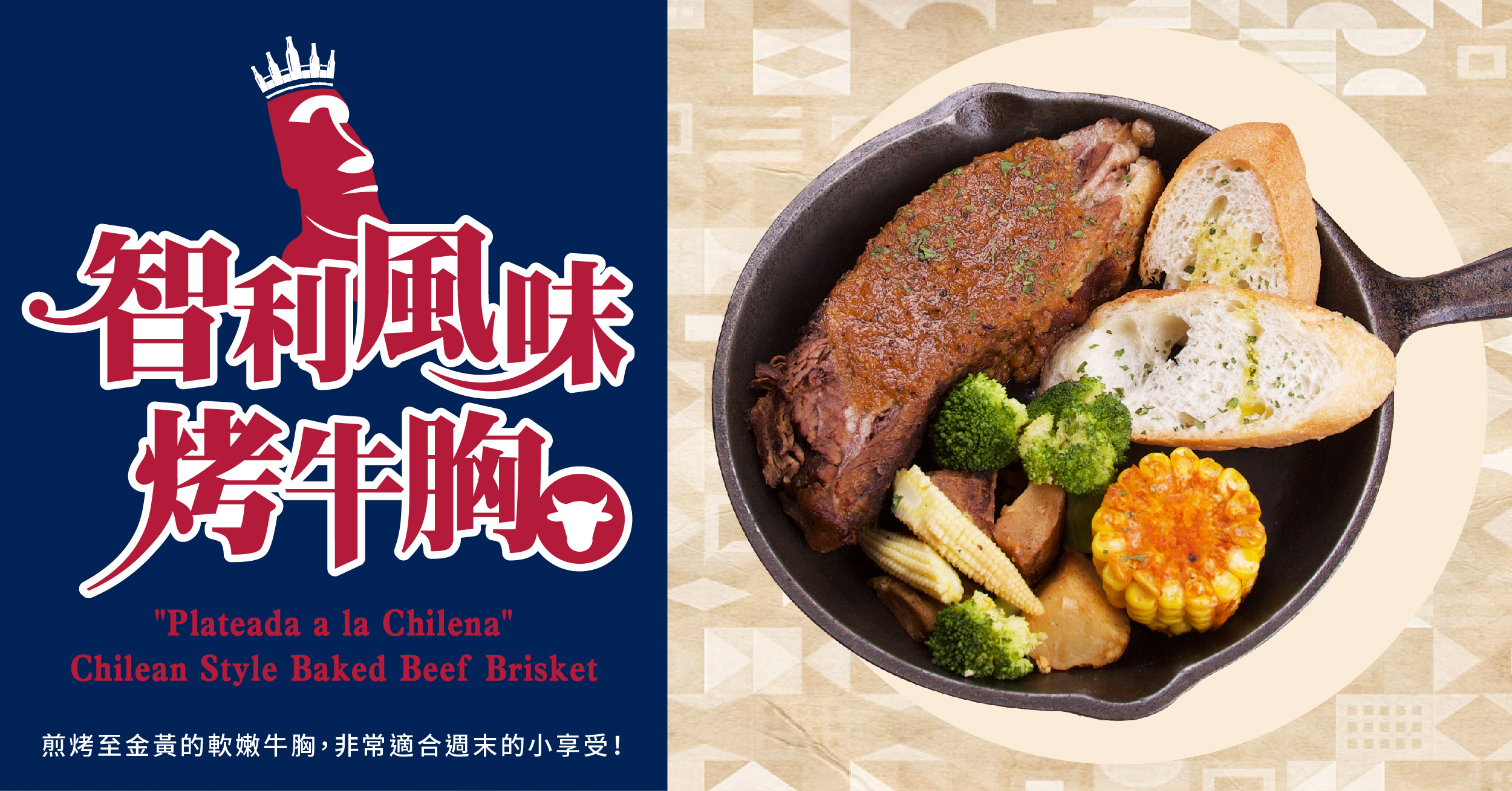 Plateada烤牛胸是智利美食之一,這道菜通常會在周末與家人分享, 是一道適合所有人的佳餚。首先使用醋、鹽、胡椒、百里香等調味料將 牛胸醃製一天,接著將牛胸表面煎到金黃上色後,再放入烤箱爐烤熟成, 鮮嫩可口的牛胸肉搭配玉米、玉米筍、花椰菜、馬鈴薯塊一起享用。