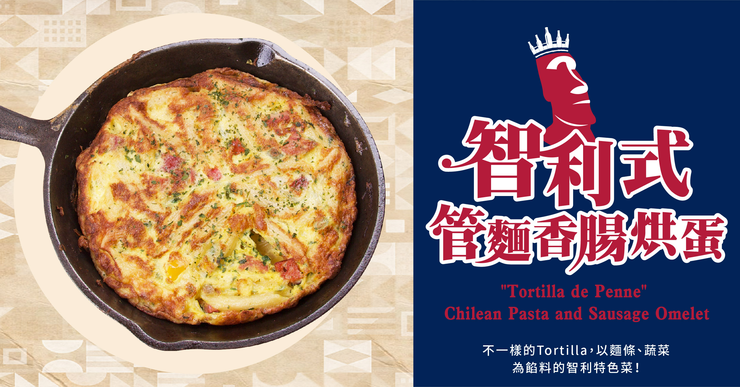 早期西班牙人曾統治過智利,因此智利在飲食上也會受到其文化影響, Tortilla de Penne意為筆管麵煎餅,此料理源自於西班牙被譽為國菜 的煎蛋餅。在智利則演變為將麵條與各式蔬菜入菜的煎蛋料理。在ABV 我們加入巴伐利亞豬肉香腸來增加口感。