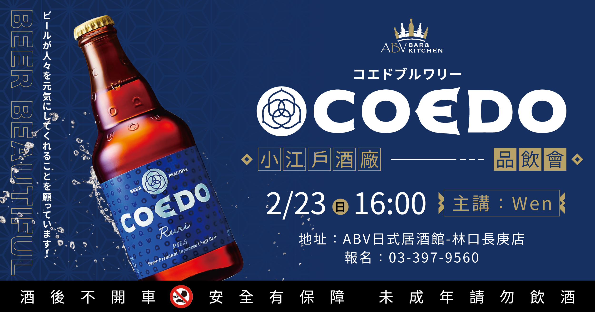 琉璃(Ruri)/白(Shiro)/伽羅(Kyara)/紅赤(Beniaka)/漆黑(Shikkoku)/毬花(Marihana)便是六款Coedo最知名的啤酒,每一款都是百分百以麥芽釀製,承如其標語 「Beer Beautiful」希望啤酒能讓人美好,品飲時再搭配適宜的料理,使所有啤酒相關的體驗昇華。這次的品飲會就讓ABV帶領各位一起品嚐來自小江戶的手工啤酒吧!