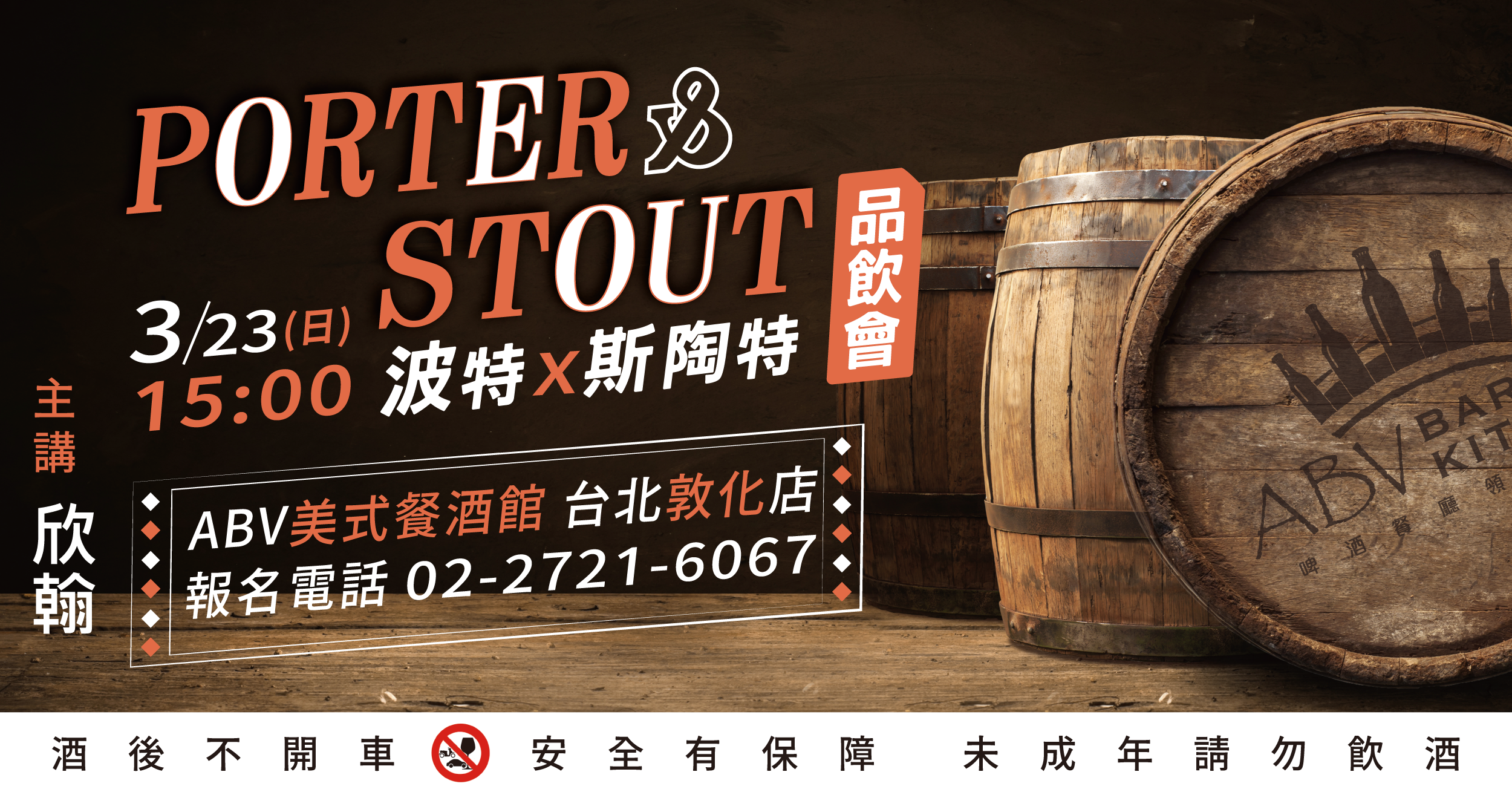 早期的波特(Porter)在釀造過程中會陳放在巨型橡木桶來增加風味,時間甚至可長達1~2年,而到了現代,對於波特的解釋已經演變為經過深焙麥芽所釀造的深褐色愛爾啤酒。斯陶特(Stout)其實就是酒精濃度更高且顏色更深的波特,他們的共通點以口感來說,最常見的就是煙燻、烘焙、咖啡、巧克力等等的風味,豐富多元的感官體驗,喜歡深色啤酒的客人更不能錯過本次品飲會。