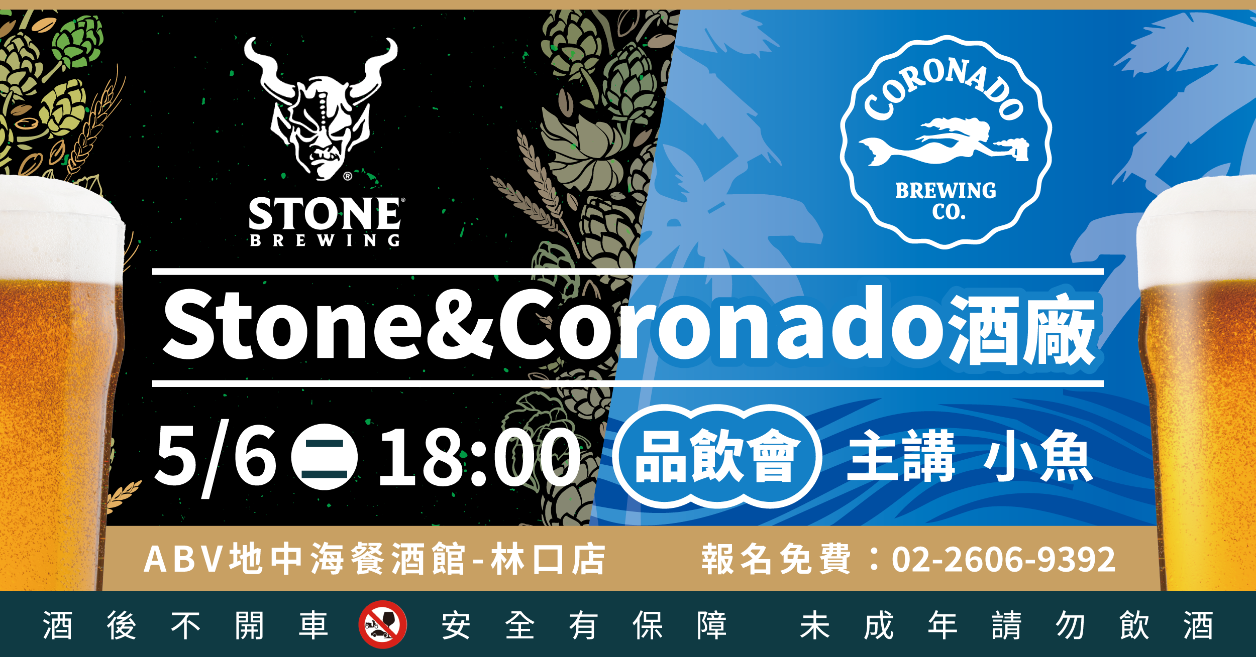 一起品味兩大來自加州的經典精釀酒廠——Stone Brewing 和 Coronado Brewing ,帶著一系列狂野又有個性的啤酒登陸ABV!這次我們精選了多款代表性酒款,從濃烈的IPA到夏日系輕盈風味,讓你一晚喝遍美西靈魂。無論你是對酒廠如數家珍的精釀老司機,還是剛入坑的微醺探險家,都很適合一起來喝喝、聊聊、交朋友。加入我們,一起在微醺中感受加州陽光、浪花與啤酒的餘韻。