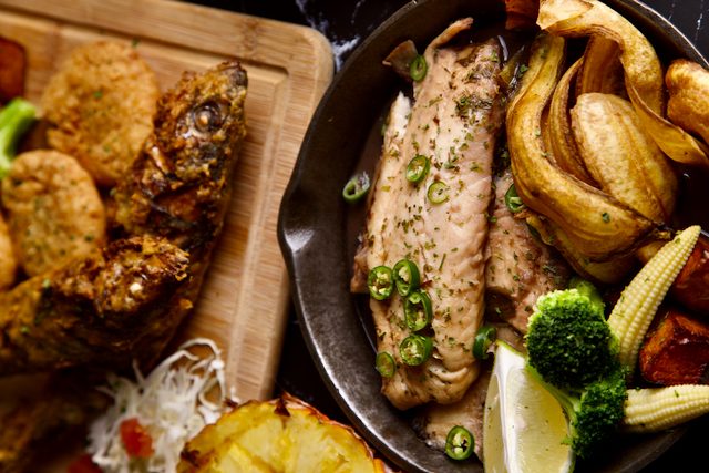 這道Blaff可以用各種魚類來料理。ABV選用鱸魚菲力,以新鮮的青蔥、巴西里、檸檬汁、蒜頭、洋蔥,百里香醃製整夜,這手法看起來跟Ceviche(檸檬漬生魚)很像,但之後,我們需要再加入一些高湯,將其燉煮至軟嫩。燉煮後就可以將魚肉起鍋呈盤,搭配炸香蕉片、撒上新鮮綠色辣椒一起品嚐。