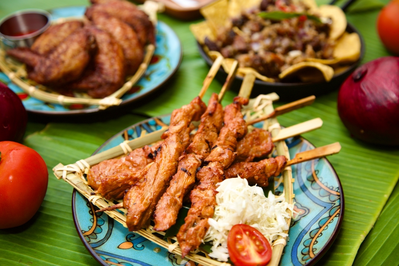 菲律賓結頭豬肉串的特色是用胭脂樹紅的辛香料來醃漬,特色的香氣有如胡椒帶點肉豆蔻的味道。