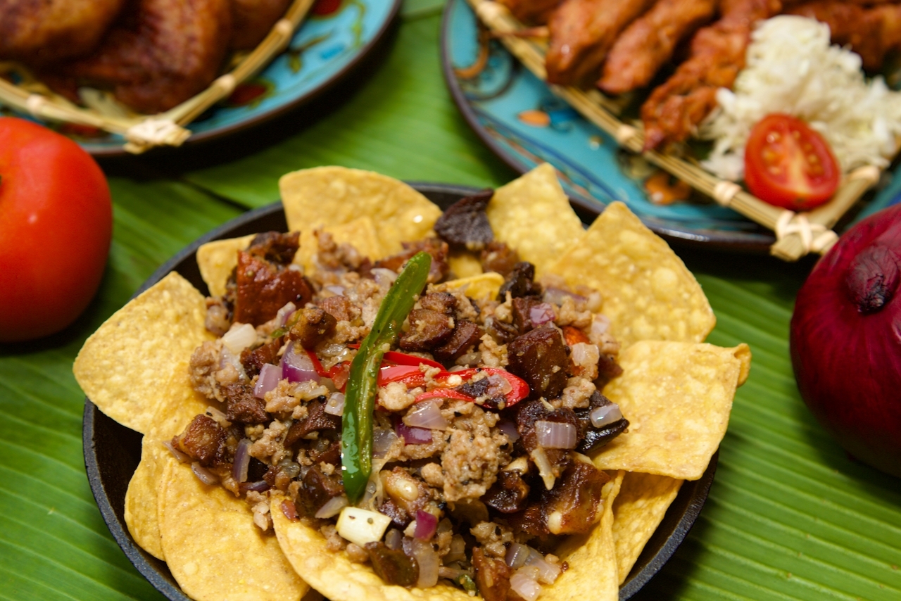 【經典菲律賓式鐵板豬雜”Sisig”】,這道鐵板豬雜料理,是將肝臟、豬頭皮、豬耳朵經炸到香酥再混合洋蔥、辣椒最後放在燒烤過的鐵板上,在上頭打顆蛋。這道菲律賓國民美食在當地是無人不知,無人不曉。除了當地人愛吃外更是被國際紐約時報票選為地表最強豬肉料理。