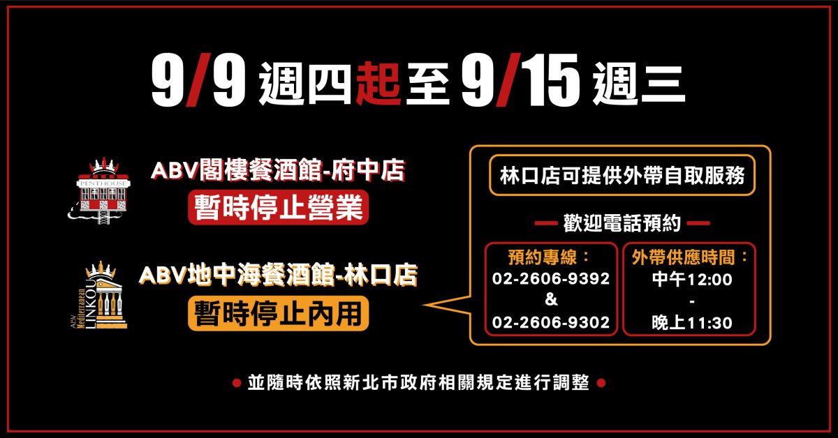 依照新北市政府通知,ABV閣樓餐酒館 板橋府中店 即日起至9月15日 星期三暫停營業,ABV地中海餐酒館 林口 […]