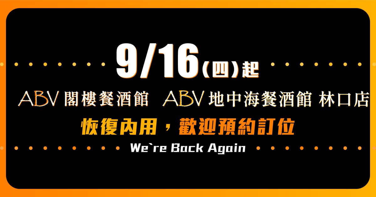 迎接曙光好消息,新北市恢復內用 ABV地中海餐酒館林口店,ABV閣樓餐酒館 再次對您說 『歡迎光臨』歡迎入內用 […]