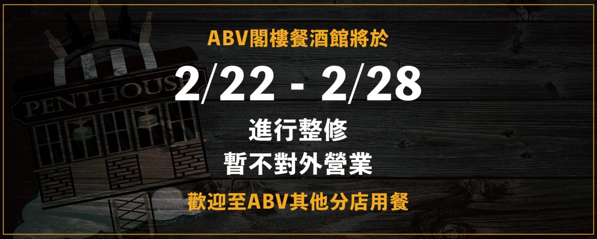 客倌們 ABV閣樓餐酒館將於2/22~2/28進行整修 為在新的一年提供給大家更好的服務及環境 請大家見諒 歡 […]