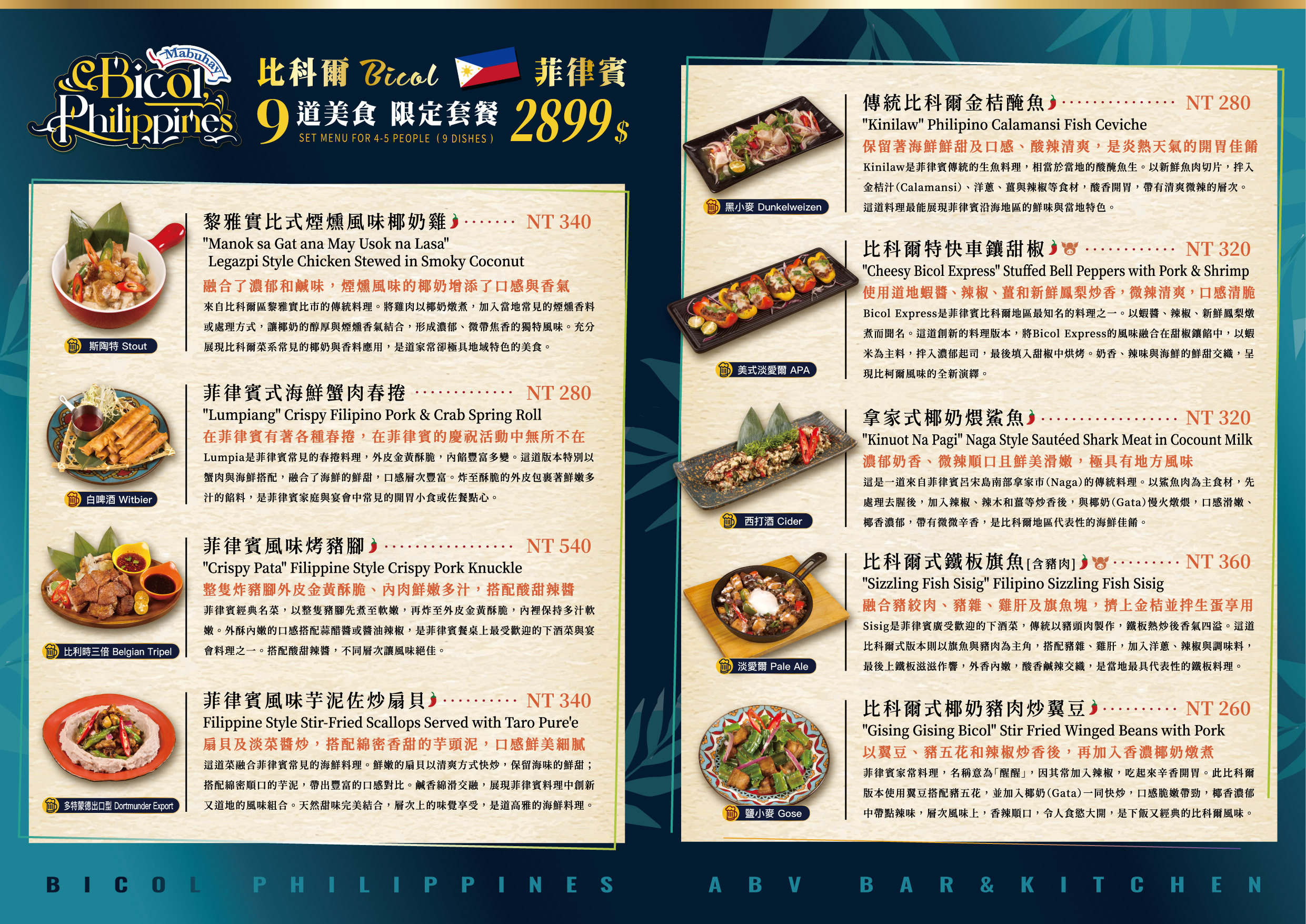 我們曾經在 Naga 市的小麵館裡,與當地人一起大口喝著熱騰騰的 Kinalas 牛腦湯麵;也曾在海邊的餐館,第一次嚐到酸香開胃的 Kinilaw 醃魚。這些在旅程中的驚喜,如今化作 ABV南洋餐酒館的「比科爾主題菜單」,把馬榮火山下的風味帶回台灣。從「黎雅實比式煙燻椰奶雞」到「傳統比科爾金桔醃魚」,每一道都辛香下飯、充滿驚喜,也因為稀有與獨特,成為近期大安區餐酒館裡最受關注的聚餐話題。無論是下班聚會、朋友小酌,還是週末家庭聚餐,這一桌比科爾的異國風味,都能讓餐桌氛圍瞬間熱鬧起來。