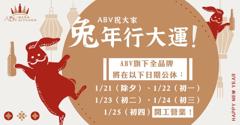 兔年行大運~~ABV也過年去~~大家初四見! 緊接著2023春節來臨,ABV也將迎來幾天小小的休息 先放大家回家過新年,家裡喝完記得要回來ABV喝捏~~~ ABV在此祝大家2023新年快樂,兔飛猛進,日飲萬升 ——&