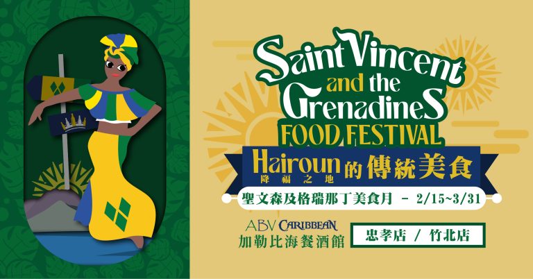 ABV加勒比海餐酒館聯合聖文森及格瑞那丁大使館,共同研究,復刻該國的傳統美食。在主廚們精心研發下,為各位呈現8道聖文森及格瑞那丁傳統佳餚,有特色風味的黑啤酒燉雞、皮酥內軟的辣味牛肉酥餅、健康美味的蟹肉蔬菜燉湯、傳統甜食的杜卡納糕,美味佳餚各