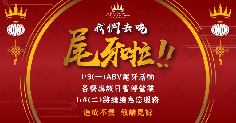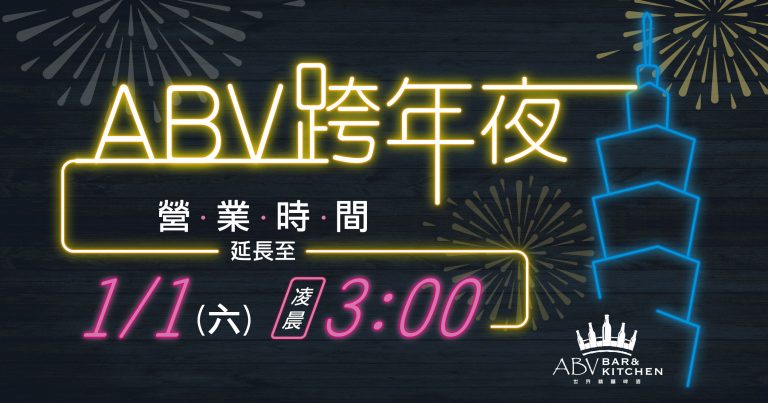 ABV在各縣市的所有餐廳,2022年1月1日,跨年營業時間延長至1月1日凌晨3點。 ABV與您一起倒數陪伴您迎接2022年!2022年1月1日中午12點正常營業。 在新的一年ABV將持續進行展店新計畫 我們要繼續邁開腳步,往前邁進🏃♂️