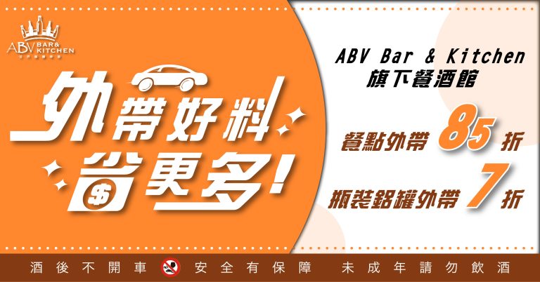朋友隔離送什麼?現在ABV的美味外帶正夯! 餐點全面85折,啤酒單瓶通通7折, 餐酒美味帶著走,送餐自用兩相宜!整個城市都是我的精釀餐酒館! 外帶料理美味不打折,讓美食撫慰心靈! 瓶裝鋁罐帶著走,讓飲品滋潤身體、清嗓潤喉! 來看看有哪些外帶