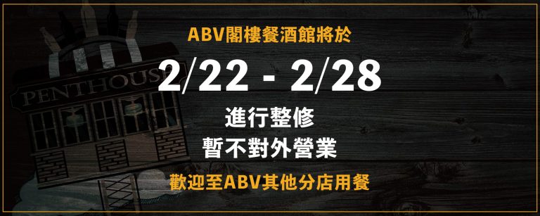 客倌們 ABV閣樓餐酒館將於2/22~2/28進行整修 為在新的一年提供給大家更好的服務及環境 請大家見諒 歡迎大家到ABV Bar& Kitchen旗下其他餐廳 繼續大口享用美食繼續暢飲啤酒 ABV地中海 餐酒館 訂位專線:02-