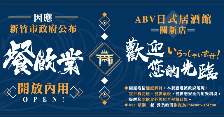 是的!因應全國防疫警戒,降為二級,且新竹市政府公告,開放餐飲內用! 所以,歡迎光臨~~ABV 日式居酒館 新竹關新店,將於7/27 星期二 中午12:00 開始營業! 8/16 星期一起,營業時間將恢復為 下午4:00~凌晨 2:00 在