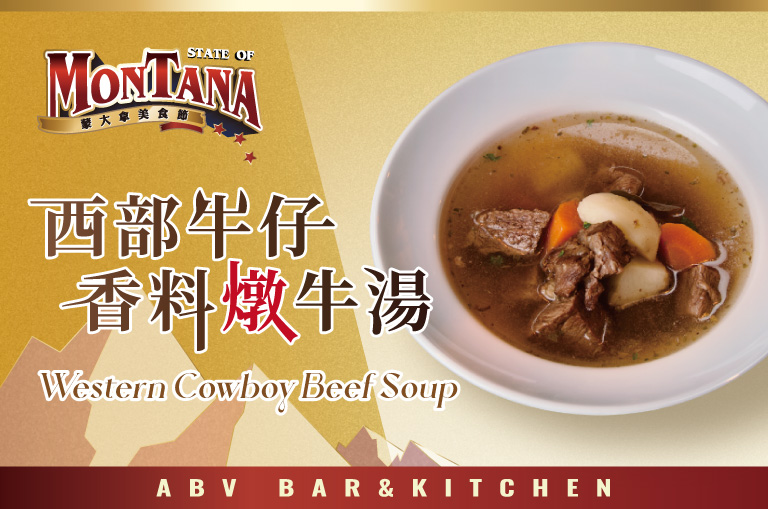 因蒙大拿州境內有 1/3 是山脈高地,2/3 則是廣袤的大草原,自 19 世紀中葉起,州際牛隻貿易和新品種的引入,牛肉也成為當地日常重要的食物來源。早期西北部牛仔會在工作後,宰殺一頭牛以示一天的辛勞。「西部牛仔香料燉牛湯」也因此而生,這道料理用牛肩胛、百里香與ABV特製香料熬製高湯。再加入胡蘿蔔與馬鈴薯燉煮,可嚐到牛肉的鹹香與蔬菜的甘甜。