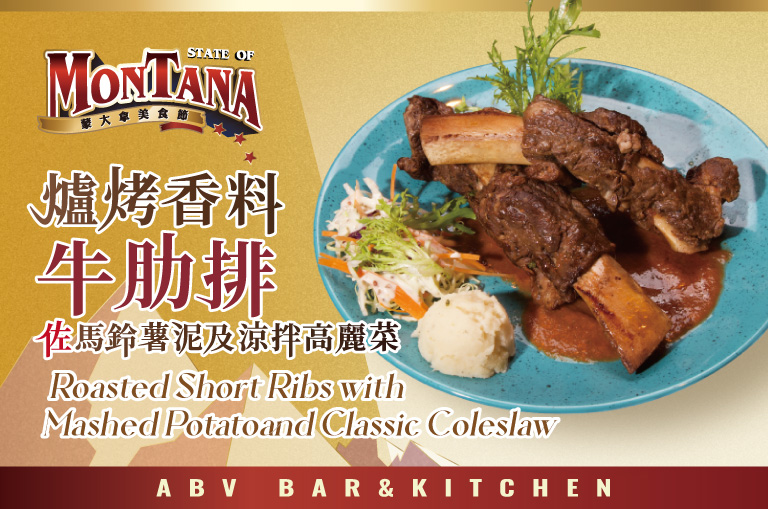 ABV先用鹽和其他香料加入紅酒煎煮牛肋排,再行爐烤。並將煎煮後的紅酒牛肉醬汁淋上爐烤後的肋排。佐以馬鈴薯泥及涼拌高麗菜,爽口又解膩。