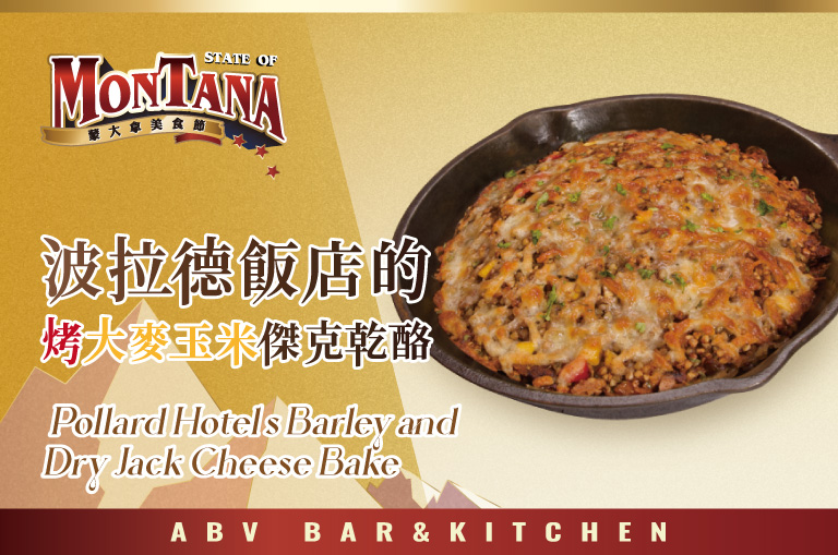 波拉德飯店的烤大麥玉米傑克乾酪——波拉德飯店是蒙大拿雷德洛治的第一座磚砌建築,於1893年落成,在1900年代初期便以精緻菜餚備受讚譽。這道深受顧客喜愛的料理,是其廚師 Scott Greenlee 利用當地盛產的穀類食材,加上具濃郁風味的傑克乾酪烹製而成。ABV將洋蔥、紅椒加入奶油炒香,再撒上傑克乳酪和大麥烘烤,建議趁熱食用風味更佳。