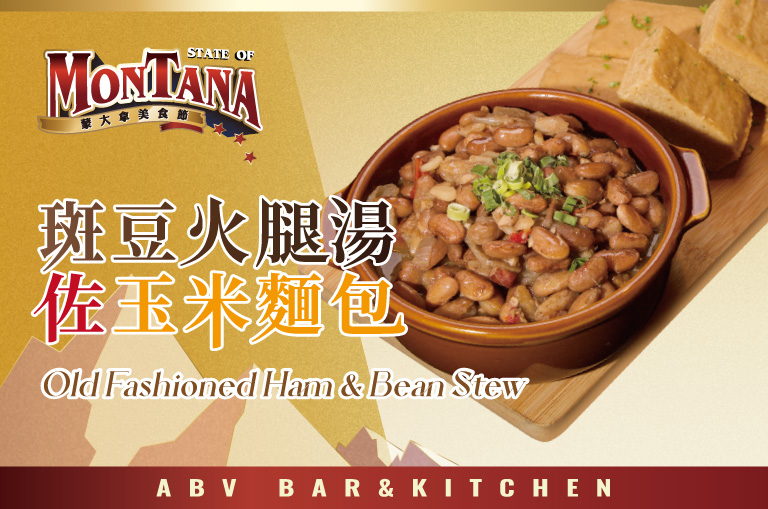 斑豆火腿湯佐玉米麵包是蒙大拿經典家常菜,融合早期歐洲移民及北美飲食文化。滿滿的斑豆加入用洋蔥炒香的煙燻火腿,再用辣椒提味,撒上蔥花點綴。佐以ABV自製玉米麵包,飽腹感十足。