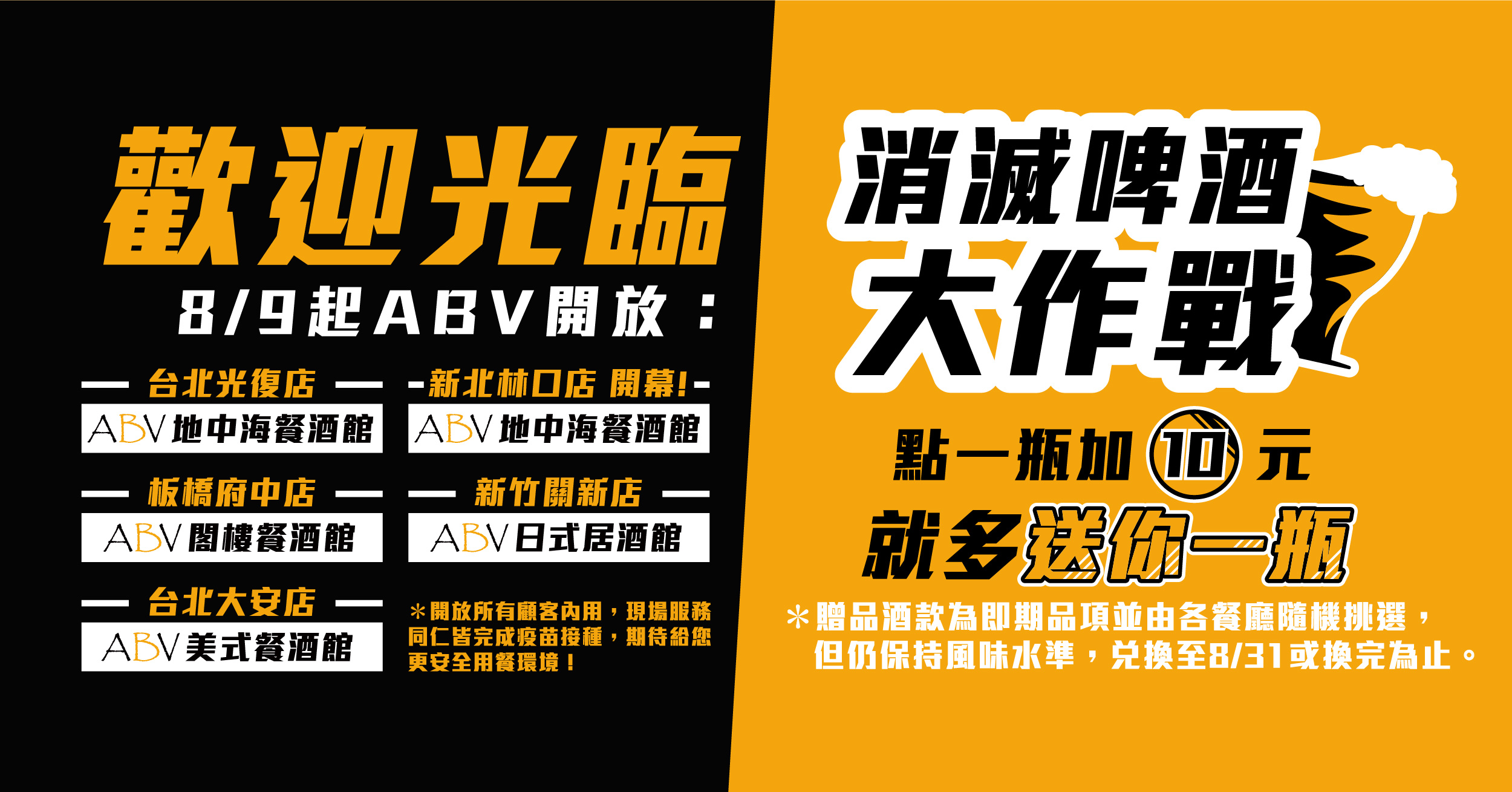 同時,ABV推出加10元多一瓶的消滅啤酒大作戰活動,詳情請見:消滅啤酒大作戰
