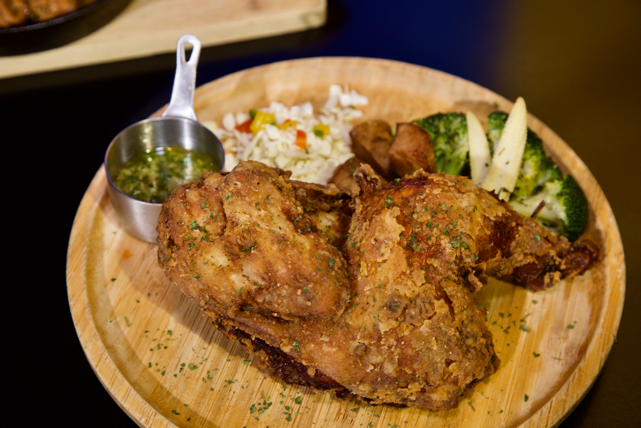 首先你一定要知道有一種傳統綠色醃料,是在加勒比海地區家家戶戶不管醃肉醃魚都會運用到。這可是聖文森及格瑞那丁大使密傳給我們。以新鮮的青蔥、青椒、蘇格蘭辣椒、巴西里、香菜、百里香、生薑、蒜頭等基礎食材打成充滿草本、一點辛辣味。在這基礎上,ABV以這醬料醃製半隻肉雞,入味之後,稍稍風乾再裹上一層薄麵糊油炸至金黃酥脆,一口咬下也充滿豐富肉汁,再搭配ABV 復刻的綠色醬料當成雞肉的沾醬,一起品嚐,感受整個加勒比海地區的當地風情。這就是「傳統秘傳醃料炸半雞」。