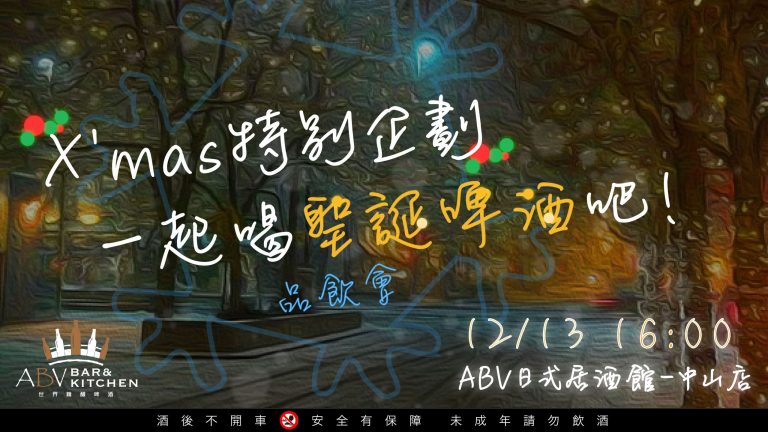 跨年就是要來點不一樣的 讓我們用不一樣的啤酒 一起嗨翻2020迎接2021 ☎☎☎限電話報名☎☎☎ ➡日期/時間:2020 年 12 月 27日 (星期日) 15:30 ➡活動地點:ABV日式居酒館(中山北路二段39巷16-2號) ➡活動名