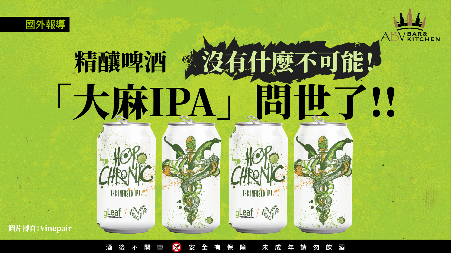 而在精釀啤酒與大麻產業蓬勃發展的美國,以瘋狂著稱的Flying Dog酒廠自是不落人後的與大麻診所 Green Leaf 合作推出第一款添加 THC 的啤酒。(THC 中文為四氫大麻酚,這是能讓人興奮的精神藥物)此款啤酒命名為Hop Chronic,據說是一款無酒精的IPA啤酒。不過,可別高興得太早,目前只作為醫療用途,僅能在大麻[合法的馬里蘭州各地的藥房購得。