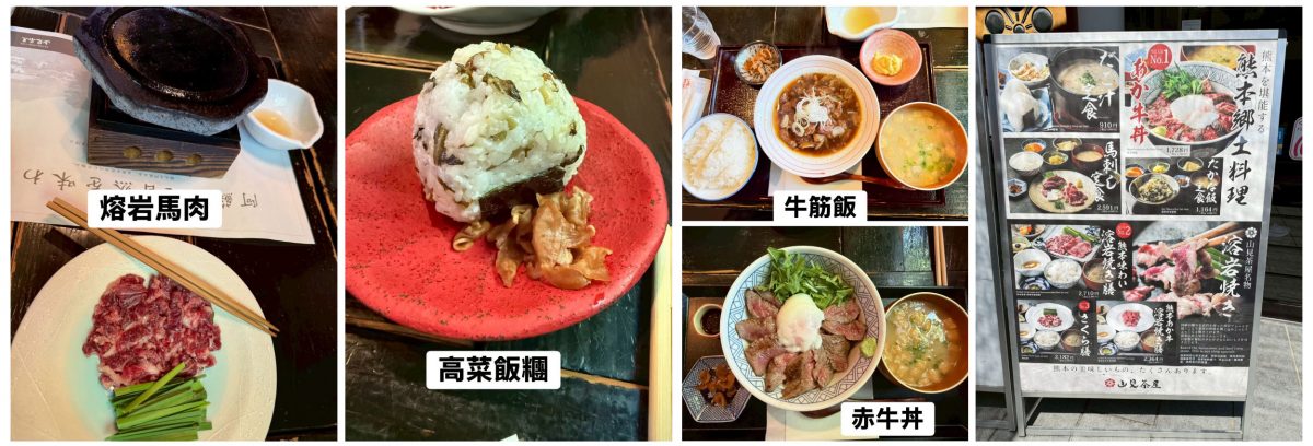 高菜飯糰(高菜めし):高菜是一種特有的芥菜,在阿蘇火山的土壤特質及寒冷氣候下,生長而成並帶有獨特的辛辣香氣。當地常製作成醃漬菜,並搭配白飯,香氣濃郁,鹹香開胃,是九州地區非常受歡迎的家庭料理。