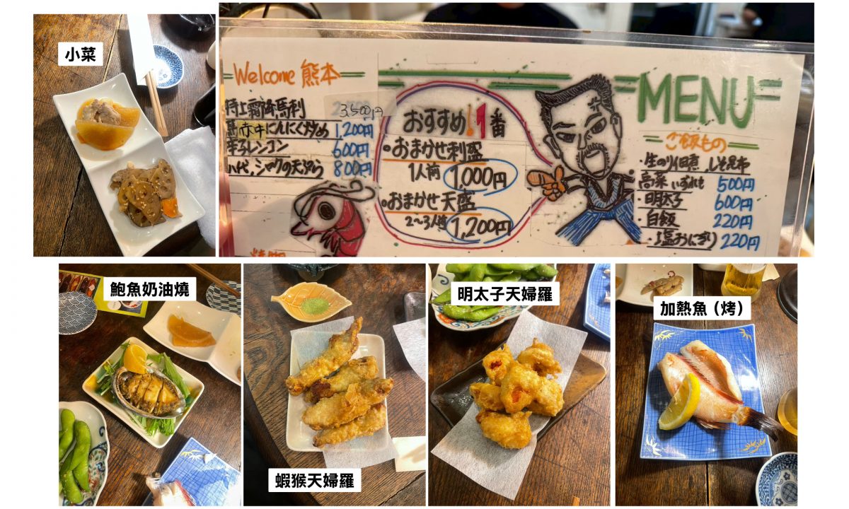 蝦蛄天婦羅(シャコぷら):是熊本夏季的特色海鮮,棲息於八代和荒尾地區潮間帶的深洞中,店家將蝦蛄炸至外酥內嫩,帶有獨特的海味與香甜肉質,是一道熊本居酒屋常見的下酒菜。